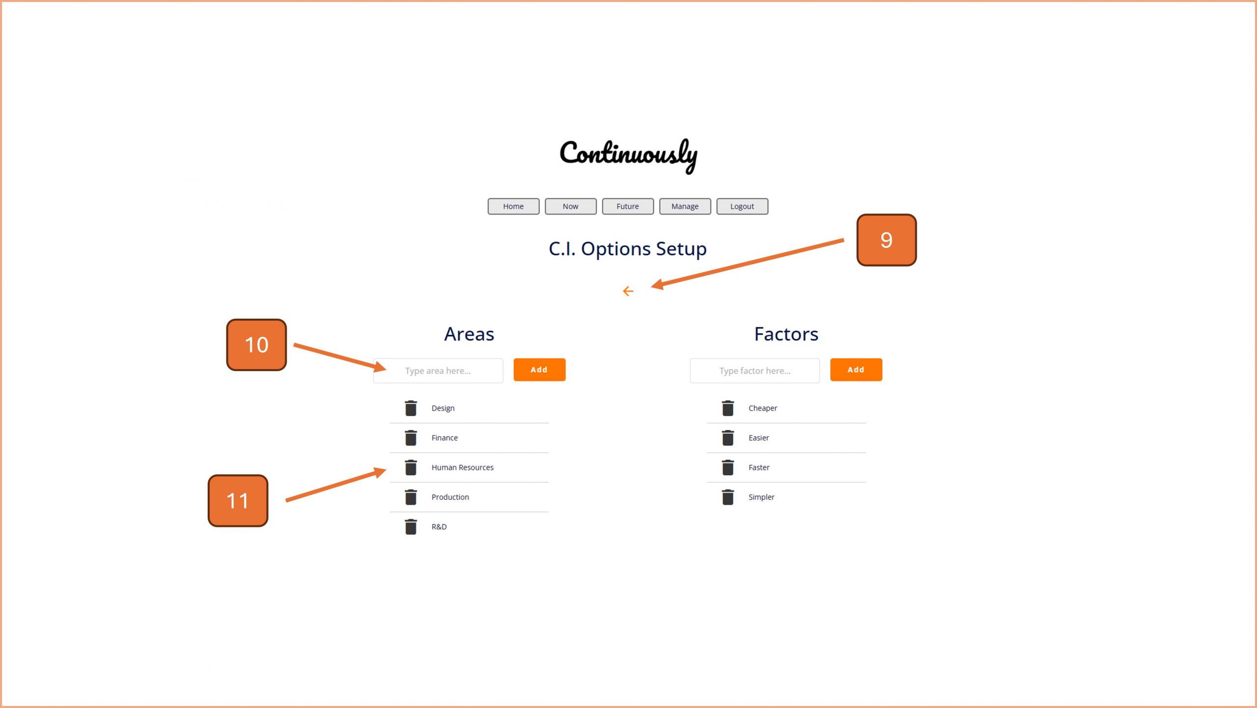 3. If you need to set up this page, to add new areas of your organisation, or improvement factors, click on this button and go to step 9.